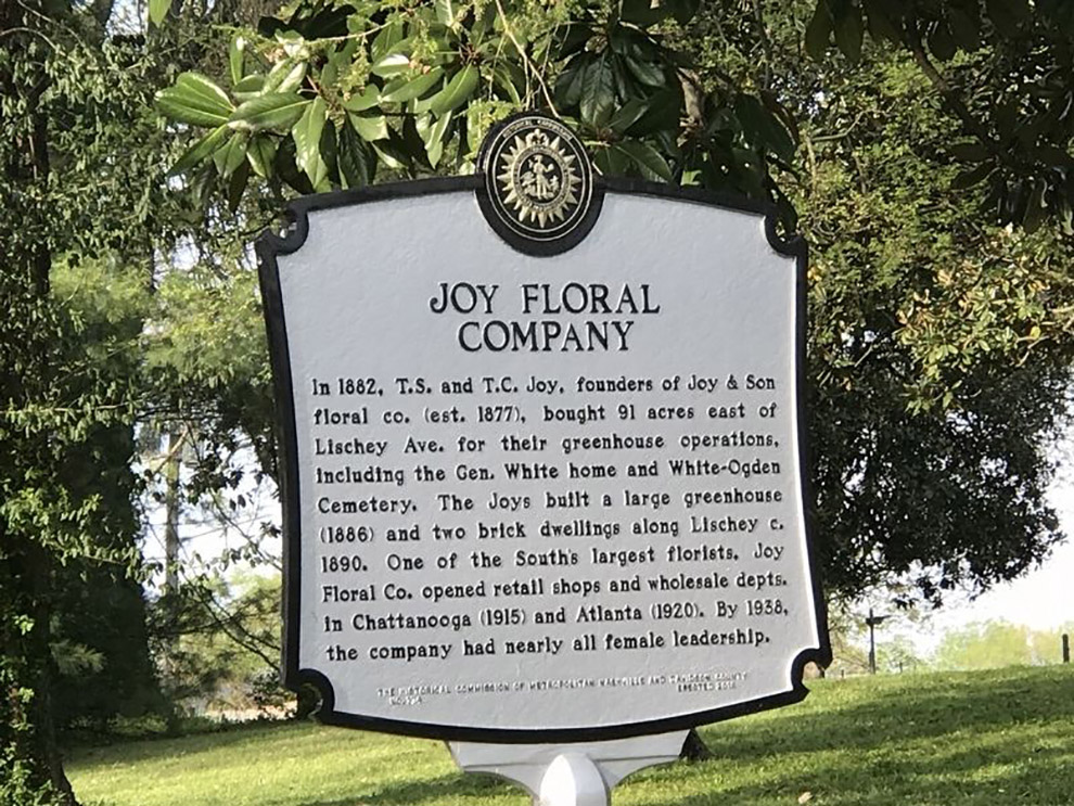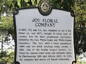 The Joys built a large greenhouse (1886) and two brick dwellings along Lischey c. 1890. One of the South's largest florists, Joy Floral Co. opened retail shops and wholesale depts. in Chattanooga (1915) and Atlanta (1920). By 1938, the company had nearly all female leadership".